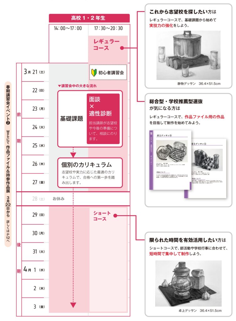 3/22[日] 4/3[金] 前期:3/22 27 17:30~20:30 後期:3/29 4/3 14:00~20:30※3/28[土]は休校 日本橋ラボは完全個別授業 卓上デッサン25.7×36.4cm 春期講習会TOP