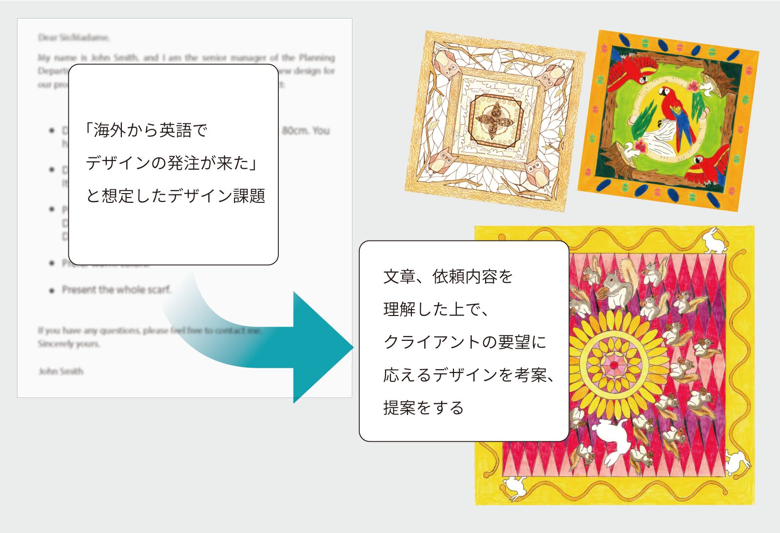 海外とのやり取りを前提とした、英語によるデザイン課題の一例。語学力の必要性を認識させながら、デザイナーとして必要な考え方、姿勢を学んでもらう。