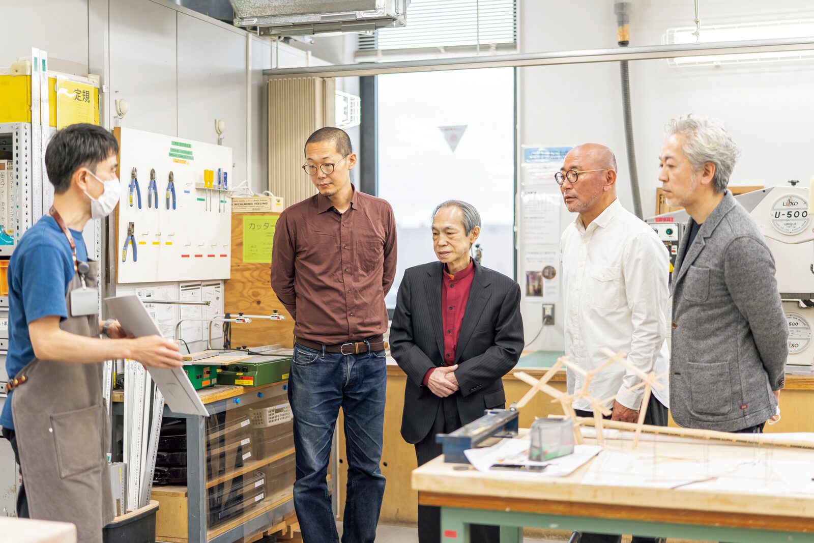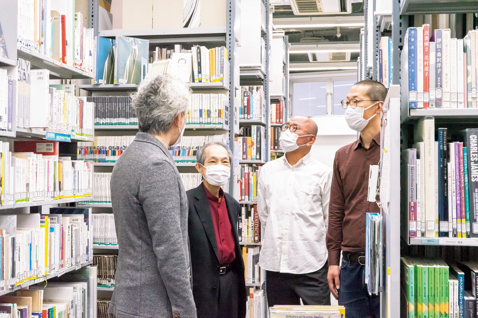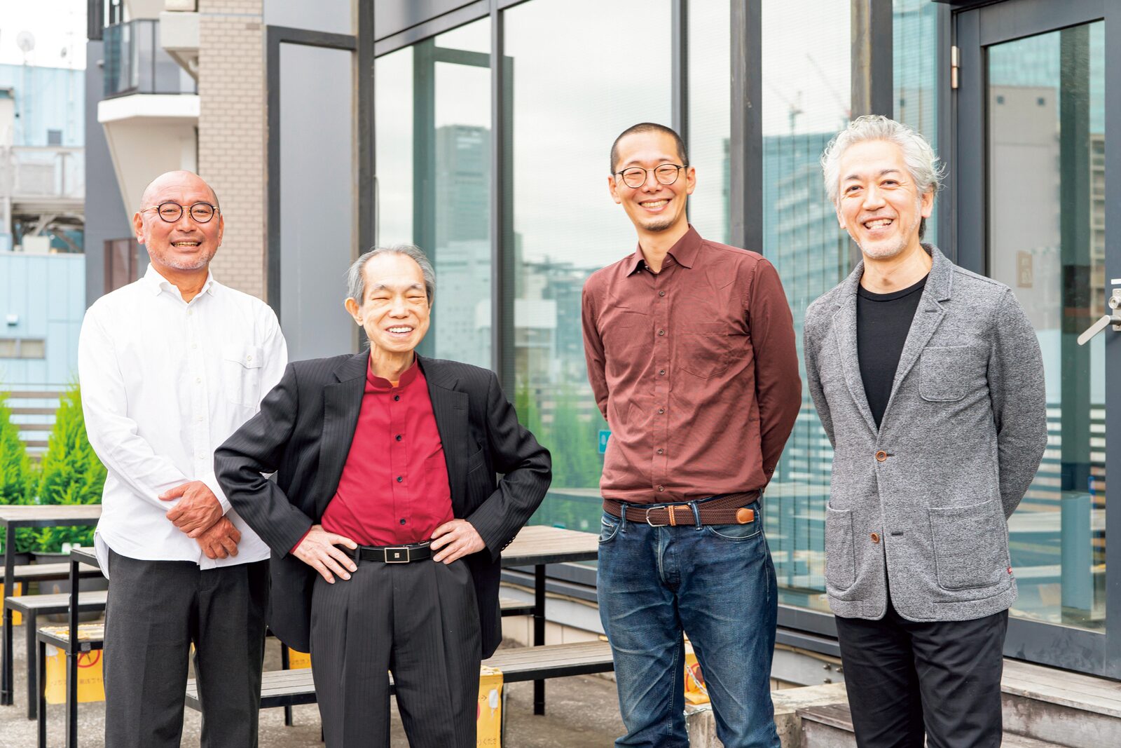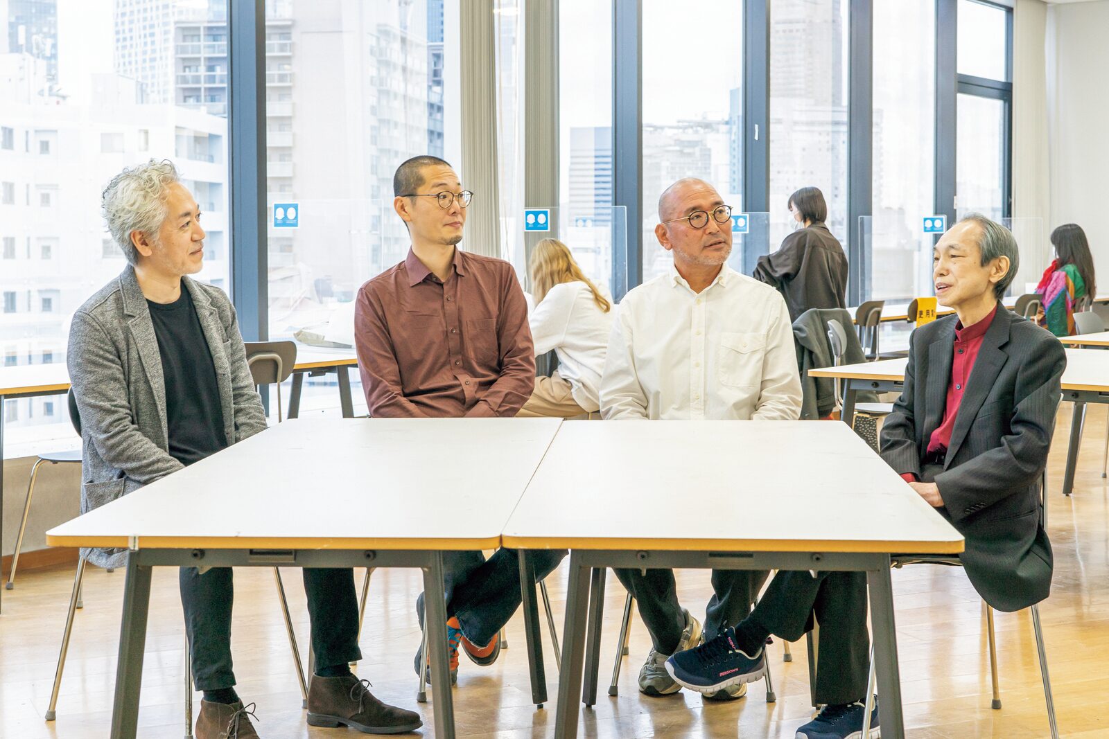 インタビューは2022年11月30日、桑沢デザイン研究所にて、新型コロナウイルス感染対策を十分にとった上で実施。写真は学生が自習や昼食場所として自由に利用することができるテラスで撮影。左から瀬尾、工藤強勝 第11代所長、佐々木、稲葉。