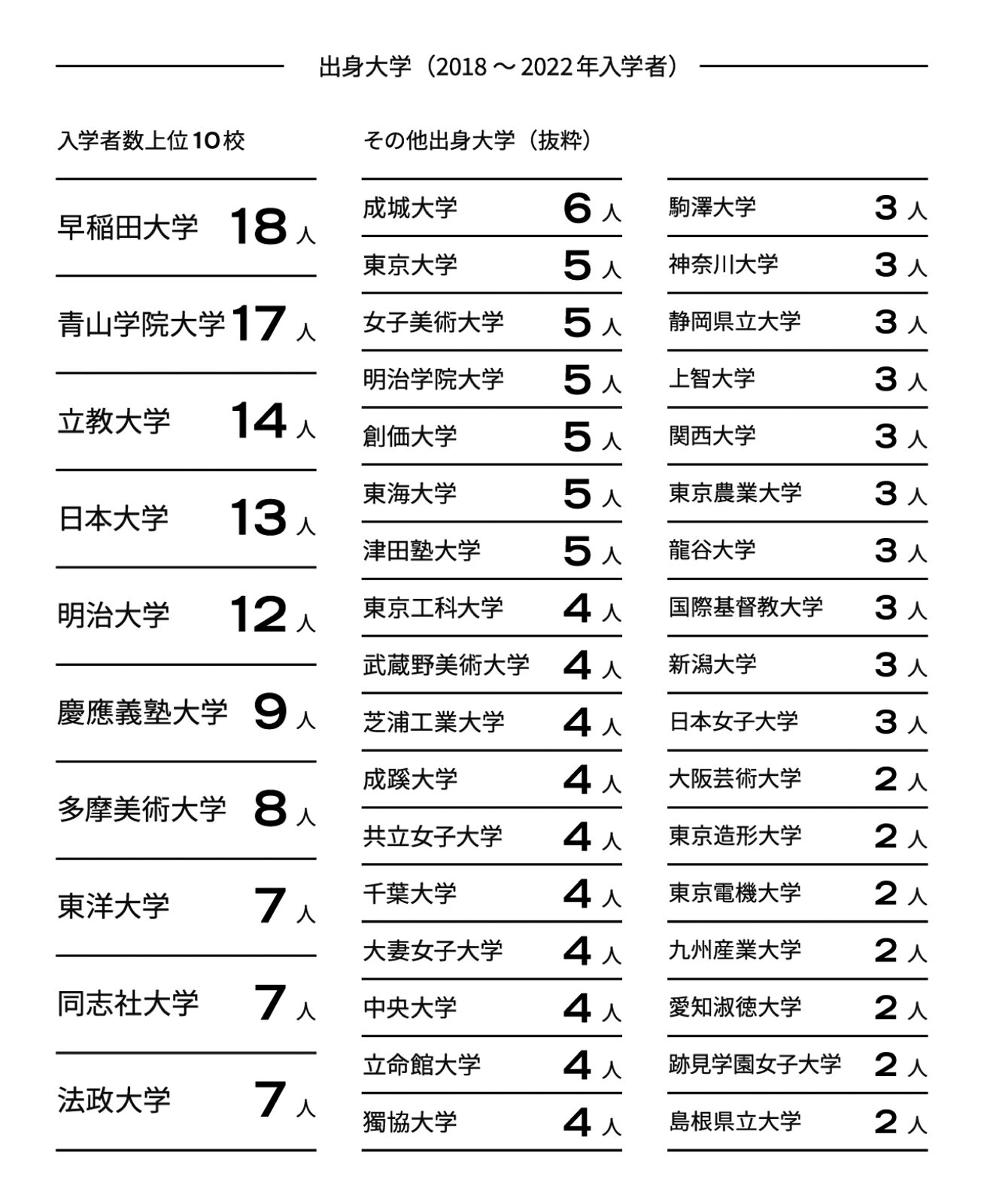 ダブルスクールや社会人の方々も多く在籍されていると思いますが、早稲田大などの有名な大学や、美大からも入学があるようですね。 -
