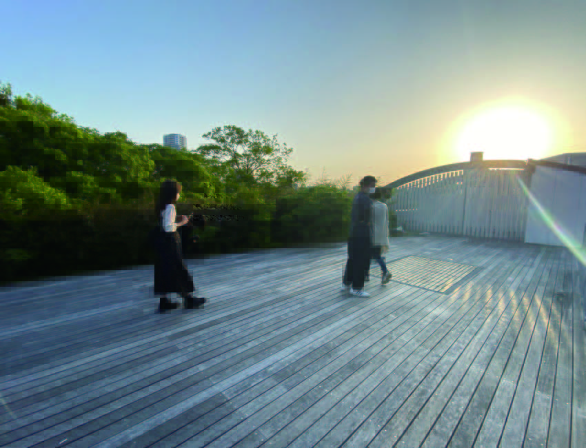 総合工房棟のウッドデッキです。夕日がよく見えて綺麗で、2年生の時はよくここでお昼ご飯を食べていました。