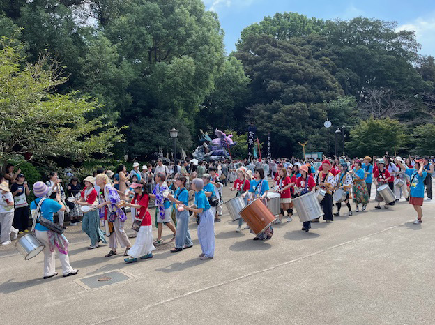 部活動のサンバ部での活動です。特に藝祭ではサンバ部が先頭になって打楽器の演奏で御輿パレードを盛り上げます。サンバ部では合宿や地域のイベントへの出演等もあり部員の絆が強いです。みんな面白い人たち。普段静かに日本画を描いている反動なのか?意外にも日本画の部員は多いです。
