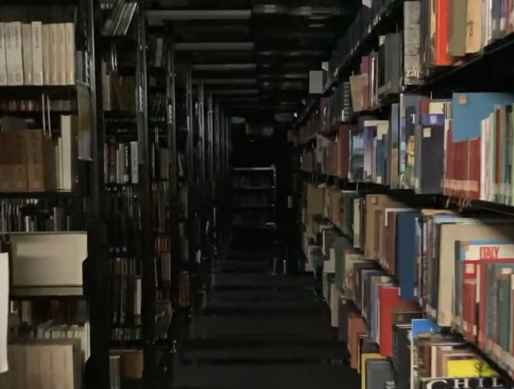 図書館の奥。配管が剥き出しで薄暗い書庫のような不思議な空間。コンクリートの階段もかっこいい。あまり人が来ないので一人になれます。書架の本はやっぱりマニアック。
