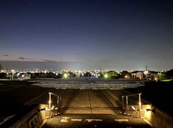 学校から見た夜景。澄んだ濃い青色の空と街の灯の対比が美しいです。
