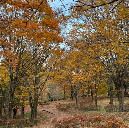 学⾷は常にあるメニューや⽇替わりの定⾷があります。昼には⼤学にコンビニが併設されているのですが学⾷が作るお弁当が売っているので、⼤変助かっています。特に私は朝⾷がおすすめです。1 ⽇のスケジュールとしては朝8時から学⾷で美味しい朝⾷をいだだきます(なんと 250 円)。⼒をつけた後授業がある⽇は教室へ、無い⽇は制作しに彫刻のアトリエの⽅へ向かいます。彫刻棟は本館から⼭がすぐ近くにある離れた場所にあるので散歩をたまにします。悠創の丘という場所があり少し登ると街全体を⾒渡せるベンチがあり、そこがお気に⼊りの場所です。夏は緑に染まり、秋は紅葉の道になるのでとても癒されます。アトリエは学年ごとに与えられその中で制作します。学年が上がるごとに⾃⾝ での選択する素材に分かれるので好きな素材が何かを1、2 年時に研究します。