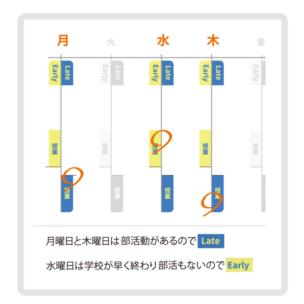 授業には『Early』と『Late』の授業枠があり、どちらも2時間制です。部活動などに合わせて曜日ごとに選択できます。